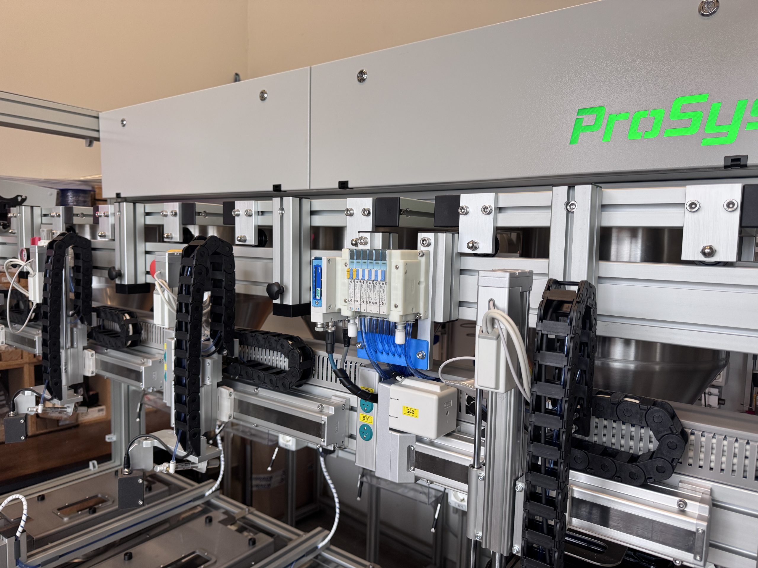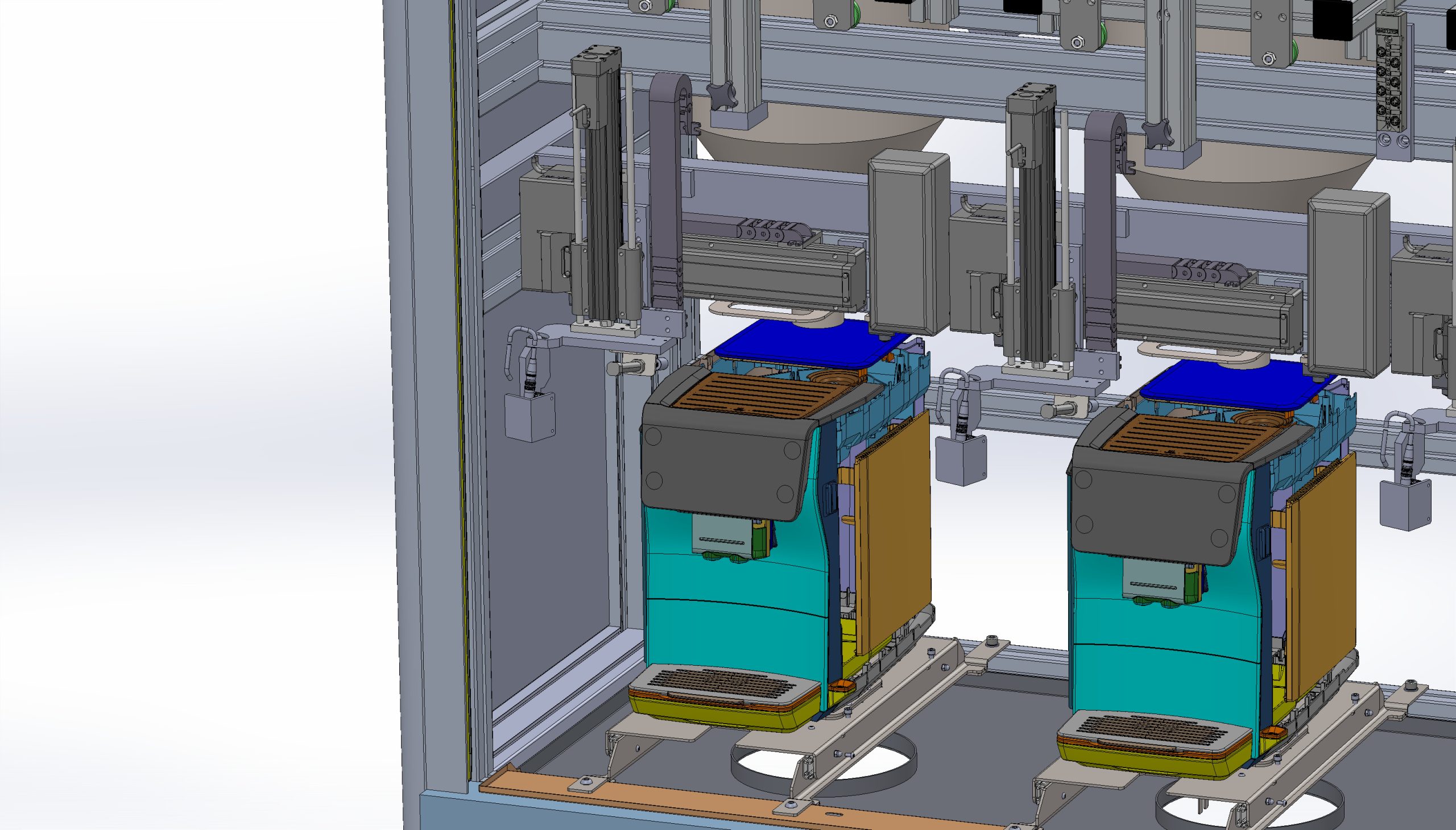 Med testom pnevmatski cilindri samodejno upravljajo aparat (vklop, izbira napitkov, premikanje iztoka in pladnja), medtem ko vision sistem preverja pravilnost sestave, prisotnost komponent in delovanje prikazovalnika aparata.